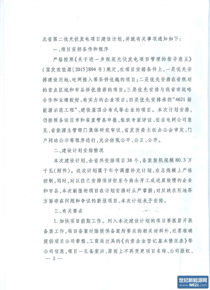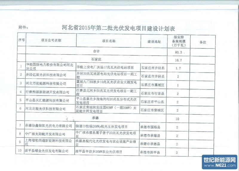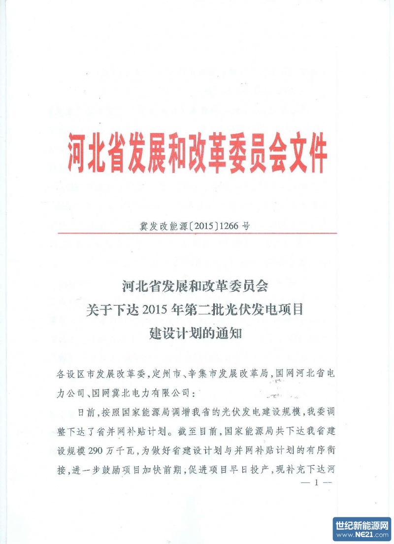河北省下达2015年第二批光伏项目建设计划的通知