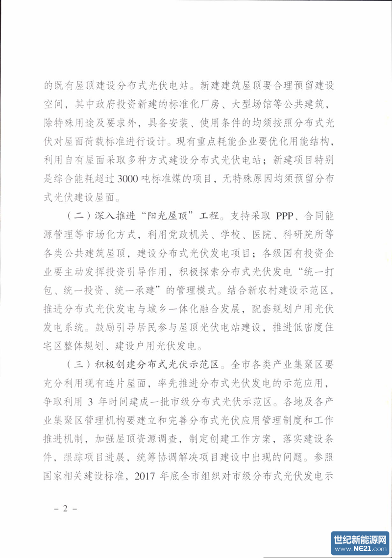 ( 二 ) 深入推进“阳光屋顶”工程。支持采取PPP 合同能源管理等市场化方式,利用党政机关、学校、医院、科研院所等各类公共建筑屋顶,建设分布式光伏发电项目;各级国有投资企业要主动发挥投资引导作用,积极探索分布式光伏发电“统一打包、统一投资、统一承建”的管理模式。结合新农村建设示范区,推进分布式光伏发电与域乡一体化融合发展,配套规划户用光伏发电系统。鼓励引导居民参与屋顶光伏电站建设,推进低密度住宅区整体规划、建设户用光伏发电。