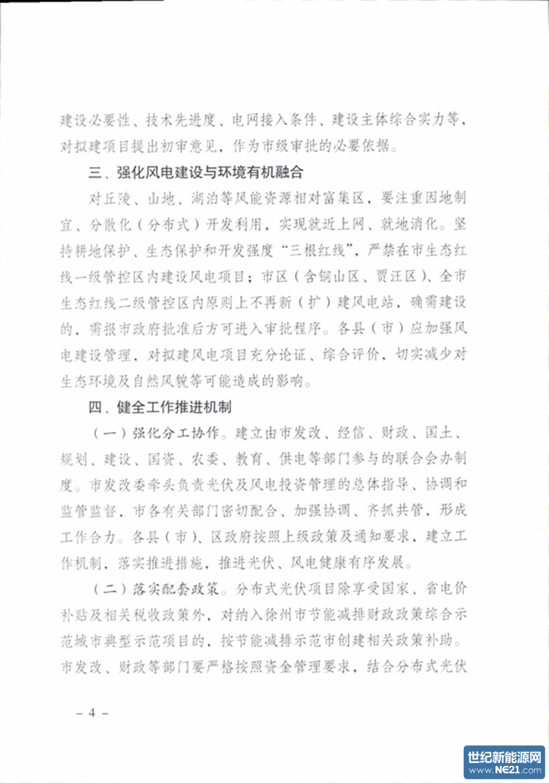对丘陵、山地、湖泊等风能资源相对富集区,要注重因地制宜、分散化(分布式)开发利用,实现就近上网、就地消化。坚持耕地保护、生态保护和开发强度“三根红线”,严禁在市生态红 线一级管控区内建设风电项目;市区 (含铜山区、贾汪区)、全市生态红线二级管控区内原则上不再新(扩 )建风电站,确需建设的,需报市政府批准后方可进入审批程序。各 县 (市 )应加强风 电建设管理,对拟建风电项目充分论证、综合评价,切实减少对 生态环境及自然风貌等可能造成的影响。
