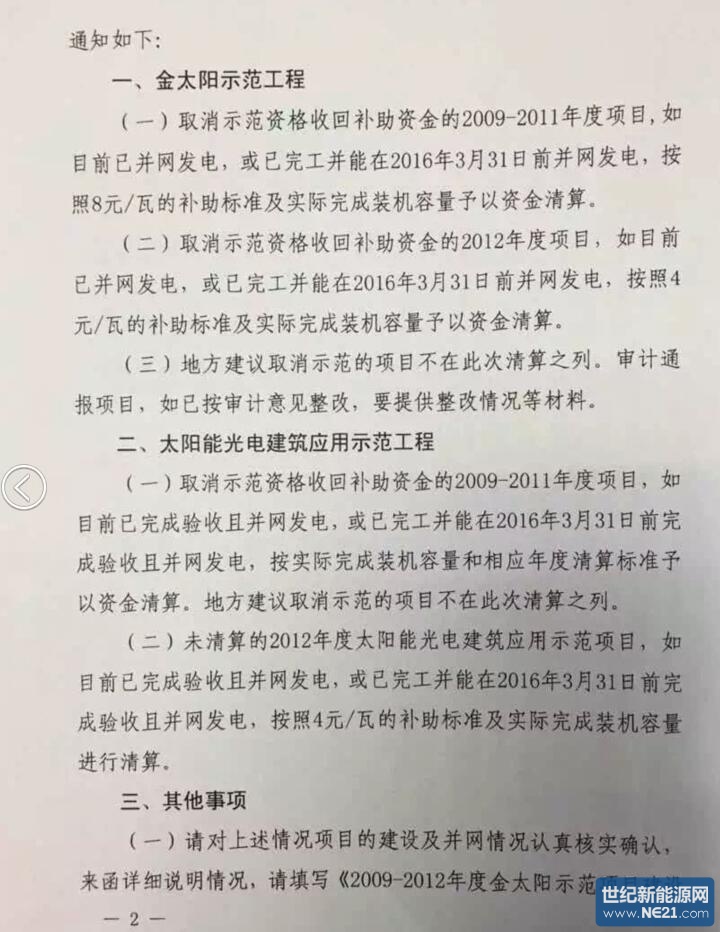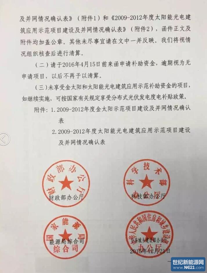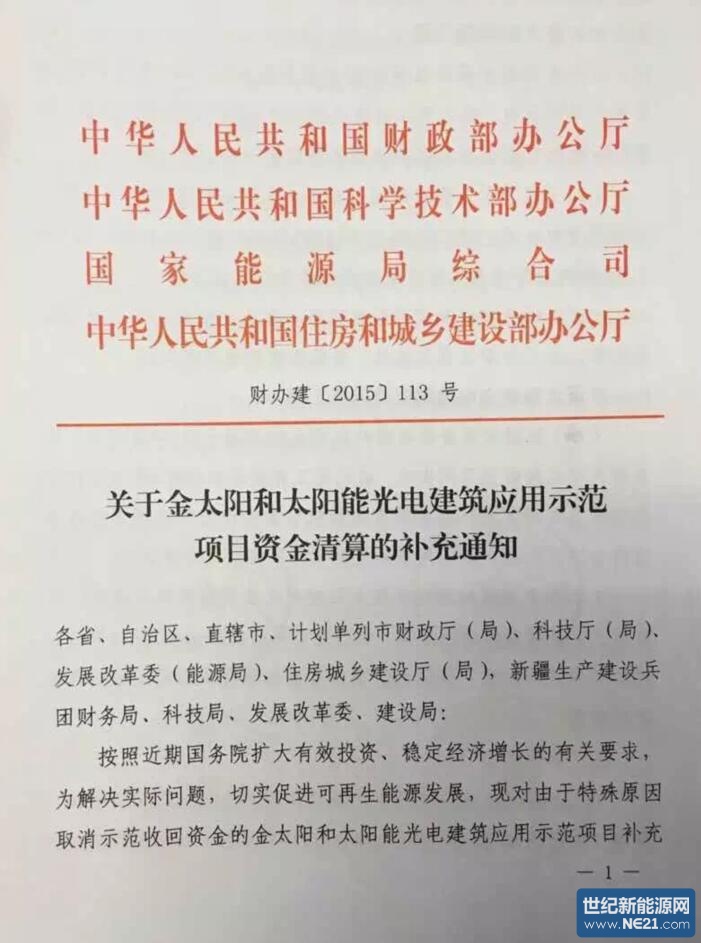 【重磅】四部委下发[2015]113号文件《金太阳和太阳能光电建筑示范项目资金清算的补充通知》