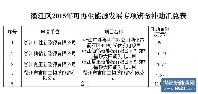衢州市衢江区公示2015年可再生能源发展专项资金拟补助项目