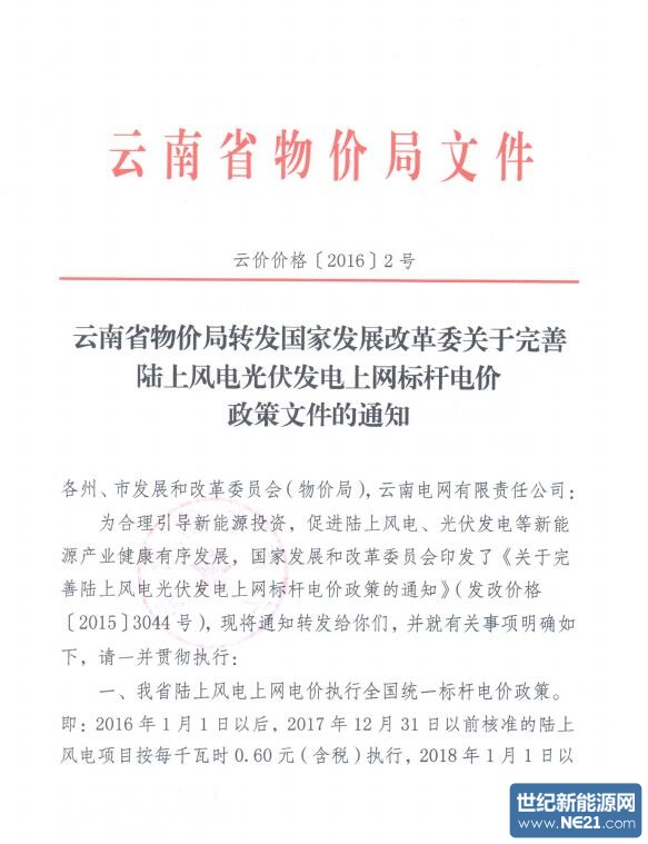 云南省物价局转发国家发展改革委关于完善陆上风电光伏发电上网标杆电价政策文件的通知