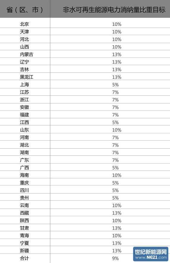 七、分步开展可再生能源开发利用目标引导工作。请各省级能源主管部门做好2015年可再生能源开发利用完成情况的统计工作,并将统计结果于2016年3月底前报送国家能源局。国家能源局在研究制定“十三五”可再生能源规划过程中,提出个省级行政区域能源消费重量中可再生能源比重目标。各省级行政区域全社会用电量中非水电可再生能源电力消纳量比重指标随文印发。请各省级能源主管部门依据上述指标编制本行政区域能源发展规划及可再生能源发展规划。