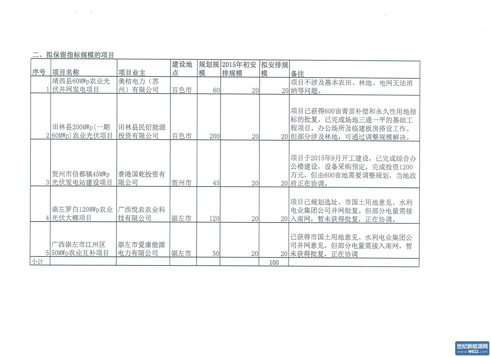 按照国家能源局《关于做好光伏发电项目与国家可再生能源信息管理平台衔接有关工作的通知》(国能综新能[2016]18号)要求,我局根据《广西壮族自治区发展和改革委员会关于我去2015年光伏电站项目评优结果的通知》(桂发改能源[2015]449号),结合各市近期上报的2015年光伏发电评优项目及建设进展情况,对2015年光伏建设方案进行了调整,重点从以下几方面进行综合比选和考虑: