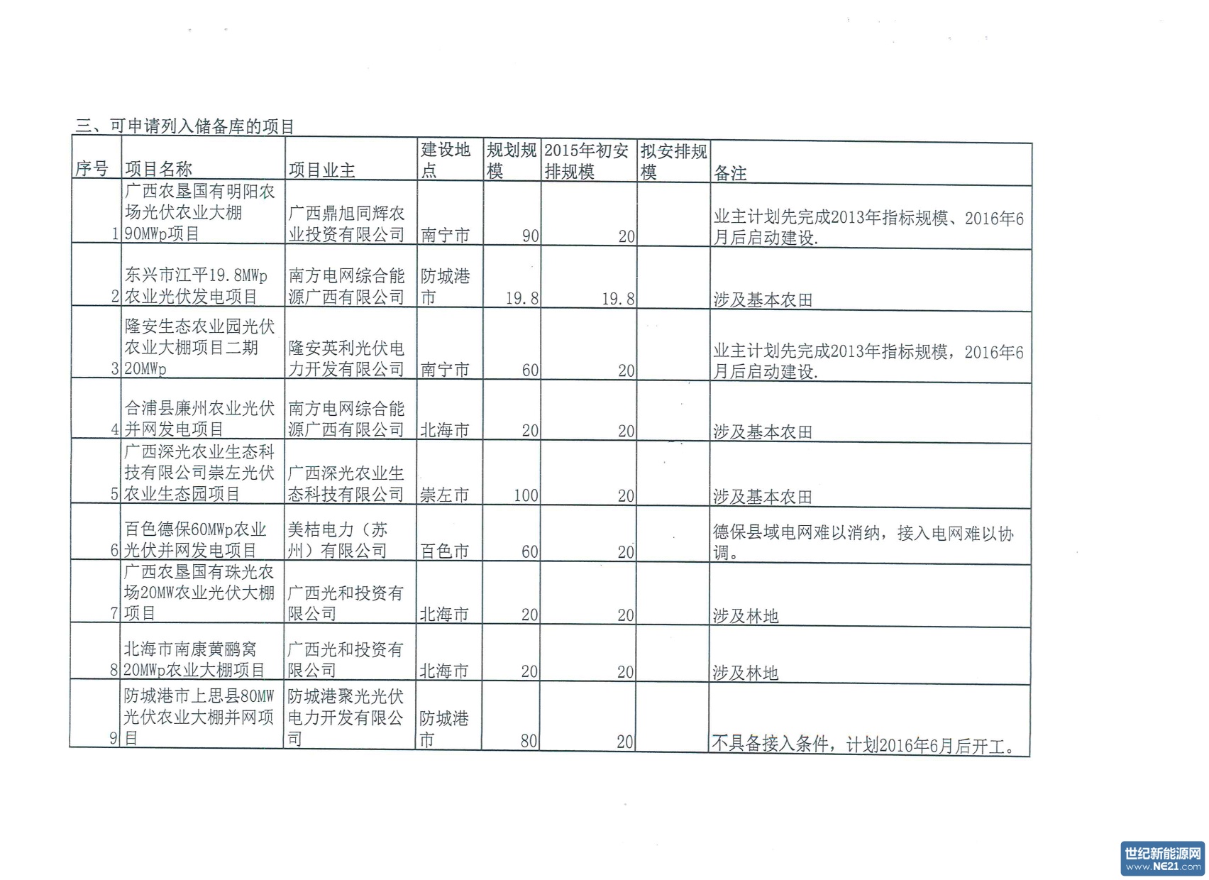 六、本次未列入2015年光伏发电建设方案的备案项目,项目单位可按照《广西壮族自治区发展和改革委员会关于完善我区光伏电站项目建设管理工作的通知》(桂发改能源[2016]84号)要求,将项目选址范围避开基本农田或林地,调整相应规模后申报列入2016年光伏电站项目储备库。同等条件下,以上项目优先列入储备库。