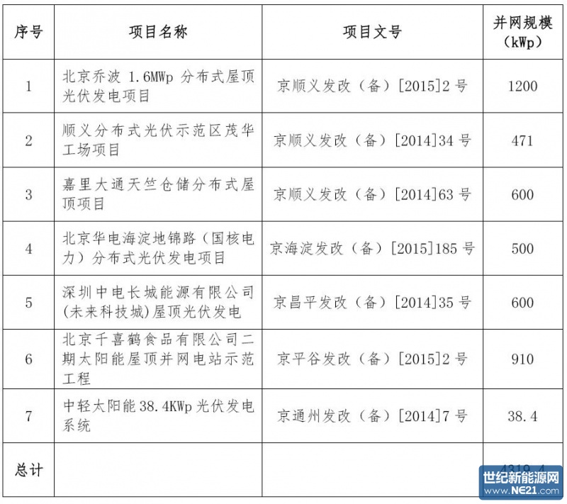 《北京市分布式光伏项目奖励名单(法人单位,第一批)》项目表