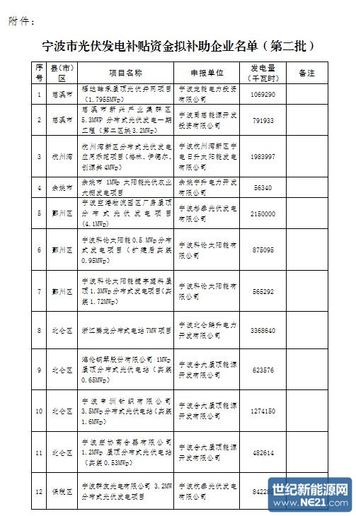 关于拟评定宁波市光伏发电补贴资金 扶持项目(第二批)的公示