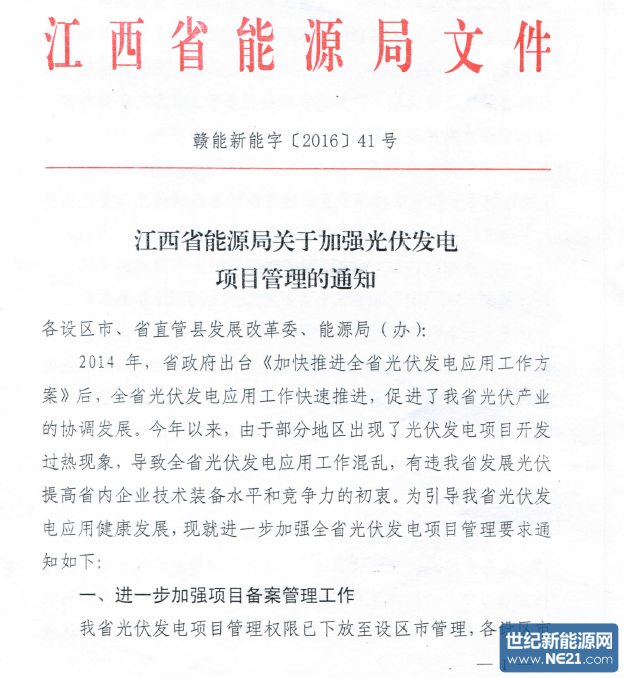 江西省能源局印发《关于加强光伏发电项目管理的通知》