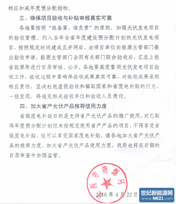 发电项目管理的通知》,(以下简称《通知》),《通知》指出,今年以来,由于部分地区出现了光伏发电项目开发过热现象,导致江西省光伏发电应用工作混乱,有违江西省发展光伏提高省内企业技术装备水平和竟争力的初衷。为引导江西省光伏发电应用健康发展,现就进一步加强江西省光伏发电项目管理要求通知。