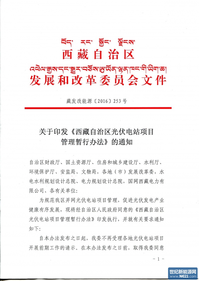世纪新能源网消息:4月27日,西藏自治区发改委印发《西蔵自治区