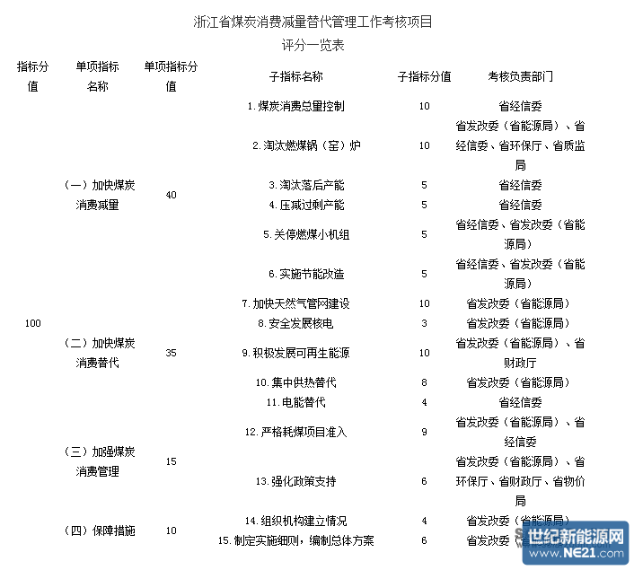 根据《浙江省煤炭消费减量替代管理工作方案》要求,考核验收内容、分值及指标设定如下: