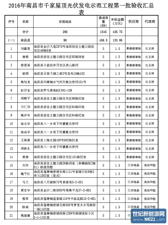 示范工程”,目前第一批已经有292户建成并网运行,共计建成并网容量1545千瓦,并且通过验收,具体情况请参阅附表。根据《南昌市千家屋顶光伏发电示范工程实施方案》,应补贴资金435.75万元。