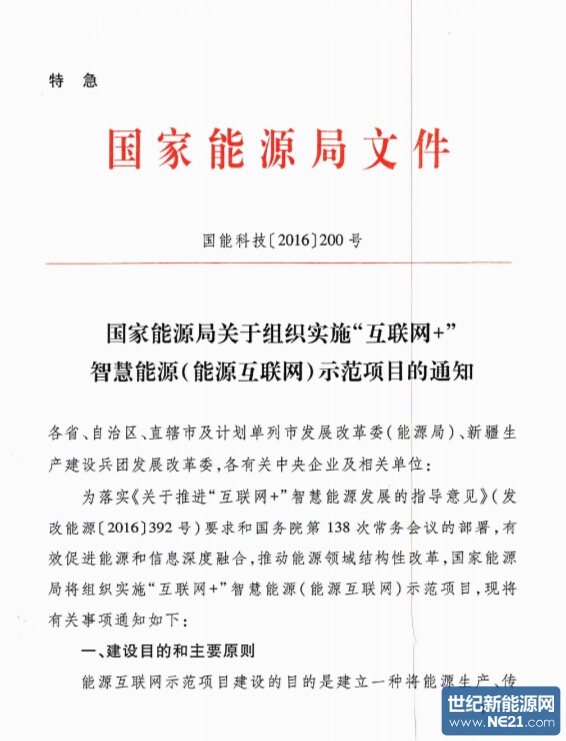 国家能源局关于组织实施“互联网+”智慧能源(能源互联网)示范项目的通知