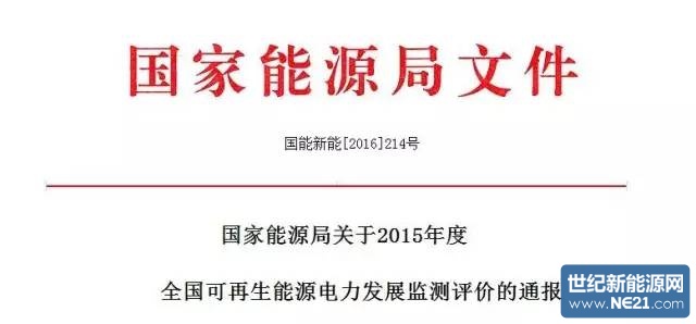 国家能源局关于2015年度全国可再生能源电力发展监测评价的通报