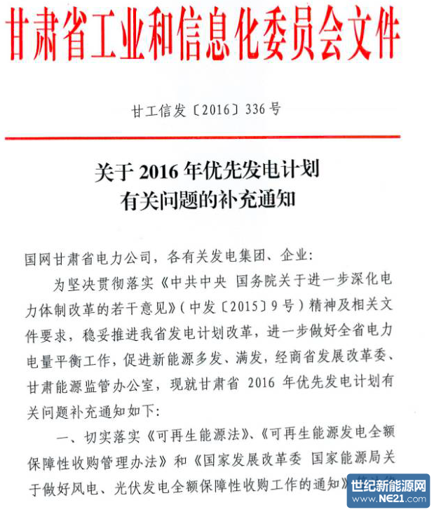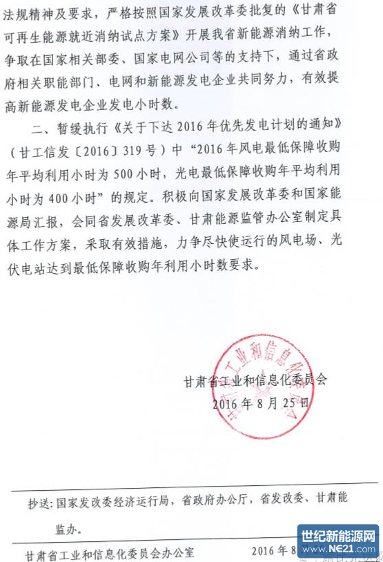 甘肃工信委发文暂缓执行“风电利用小时500光伏利用小时400”的文件