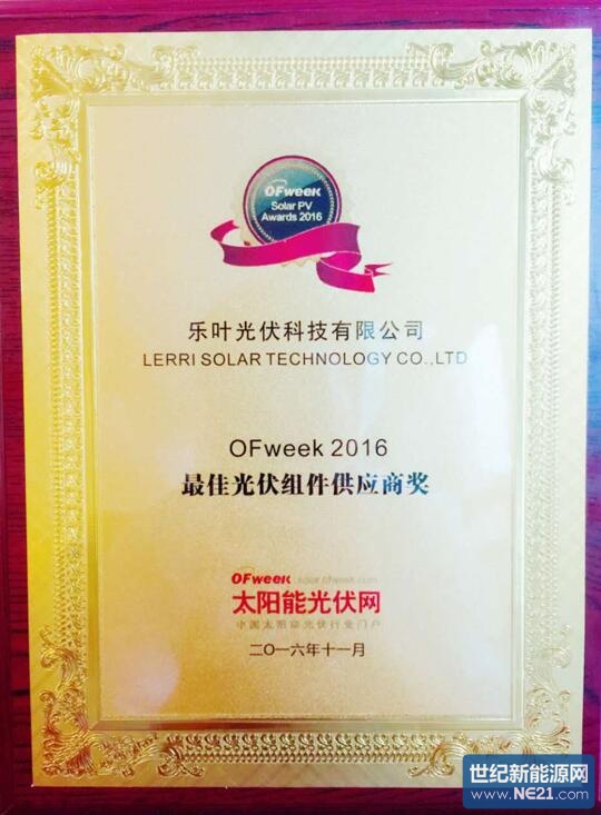 颁奖盛典上,ofweek2016最佳光伏组件供应商揭晓,乐叶光伏斩获此奖项。主办方颁奖时表示:乐叶光伏用了不到两年的时间,推动中国高效单晶组件市场份额从5%提高到25%。截至2016年底,单晶组件产能将达到5GW,是全球最大的单晶组件供应商。乐叶光伏能在本届“OFweek 2016中国太阳能光伏行业年度评选”中脱颖而出,是乐叶光伏实力的体现,也是业内对乐叶光伏在太阳能产业中所作出的贡献的一种肯定。