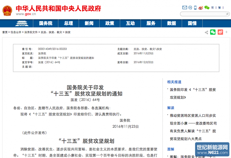 通知还提出:优先布局建设能源工程。积极推动能源开发建设,煤炭、煤电、核电、油气、水电等重大项目,跨区域重大能源输送通道项目,以及风电、光伏等新能源项目,同等条件下优先在贫困地区规划布局。风电、光伏发电年度规模安排向贫困地区倾斜。