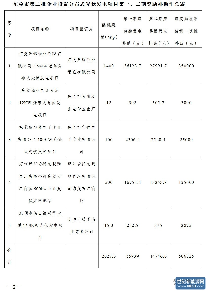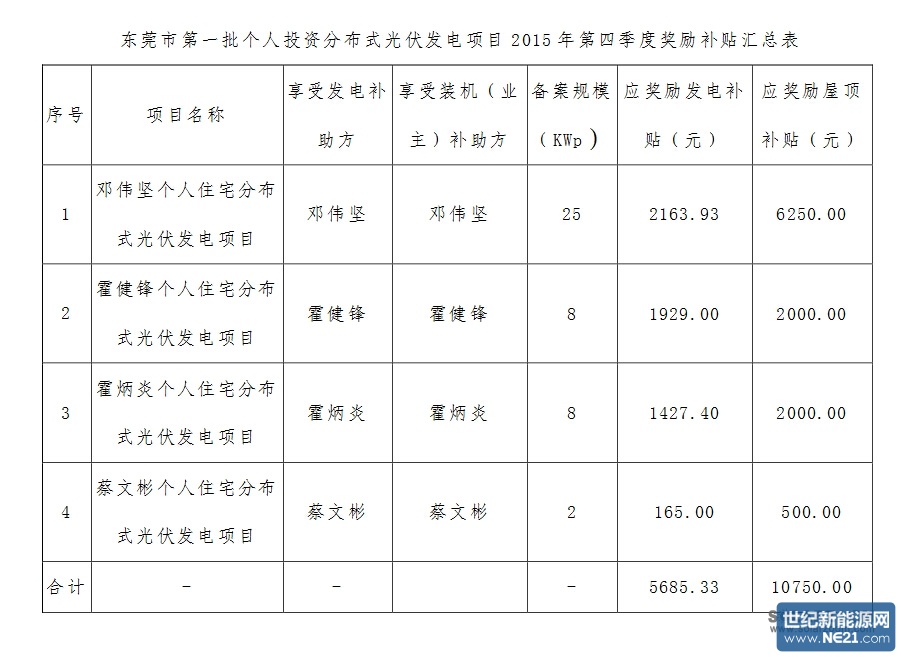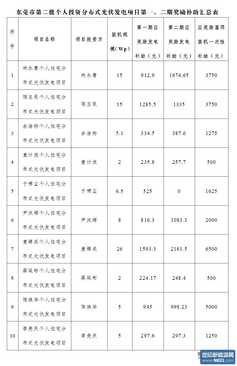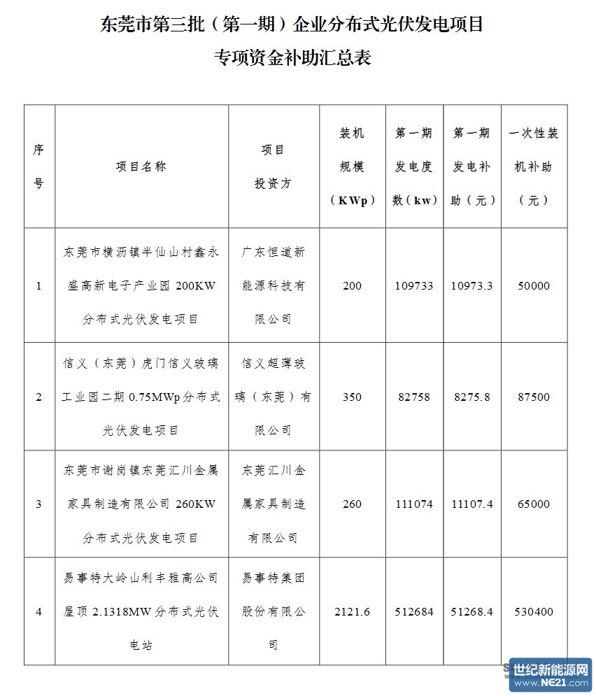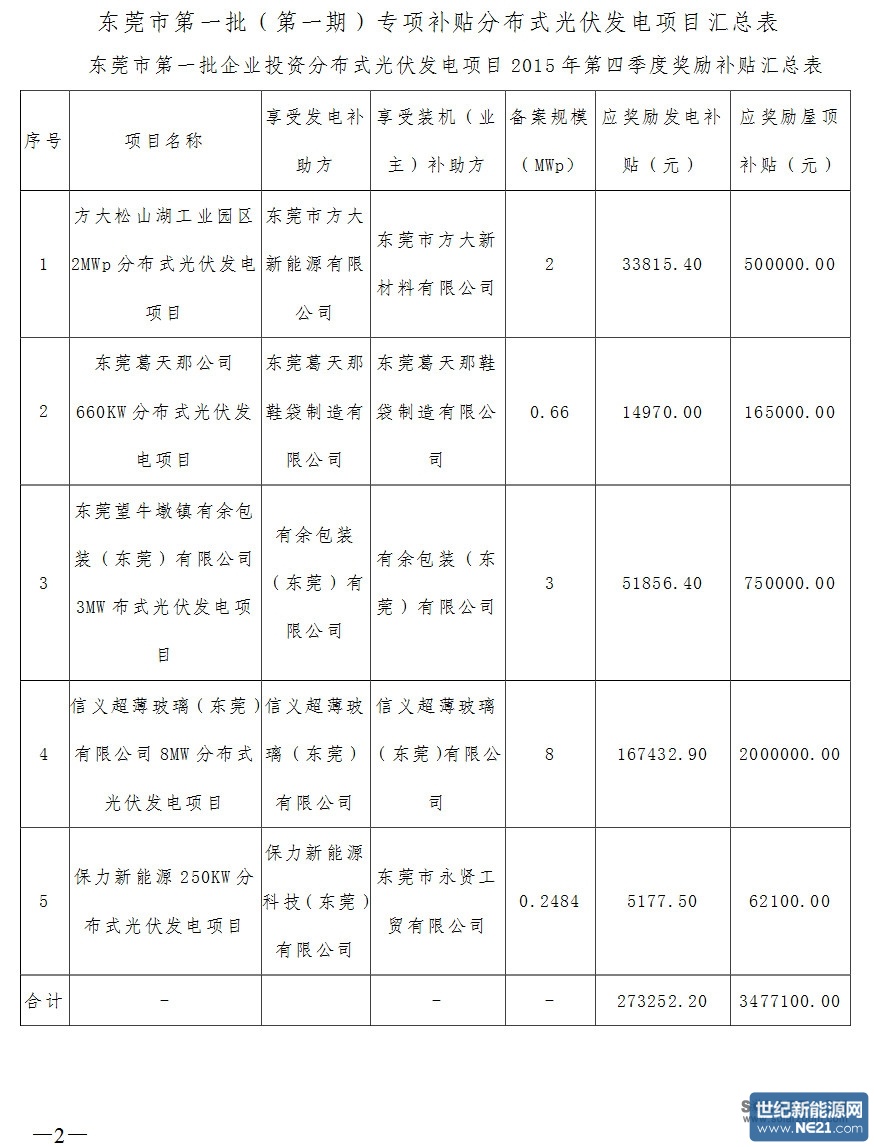 光伏发电资金补助项目的通知》(东发改〔2015〕303号)。今年,根据此《通知》,经供电部门统计、市发改局审核、市财政局复核,东莞市发改委确定第一批(第一期)分布式光伏发电项目专项补助资金3766787.53元(详见附件),第二批(第一、二期)分布式光伏发电项目专项补助资金共685801.23元(详见附件),第三批(第一期)企业分布式光伏发电项目专项补助资金共2189080.7元(详见附件),总计拨付6641669.46元分布式光伏发电项目专项补助资金。