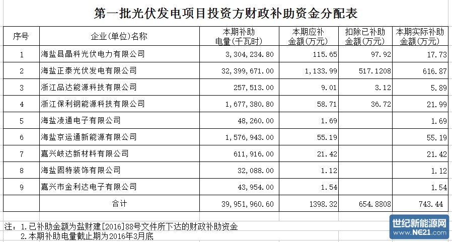 为促进我县光伏产业健康发展,根据《海盐县人民政府办公室关于印发〈海盐县推进工业强县建设加快转型发展财政扶持若干政策〉的通知》(盐政办发〔2015〕65号)精神,按照《海盐县企业财政性扶持资金管理办法》(盐财企〔2016〕1号)规定,经审核本次共有9家企业符合补助条件,报经县政府批准,现拨付第一批光伏发电项目投资方财政补助资金743.44万元,其中资金89.324878万元列公共财政预算上级补助款“其他节能环保支出”科目,资金654.115122万元列专用基金“工业发展资金”支出。