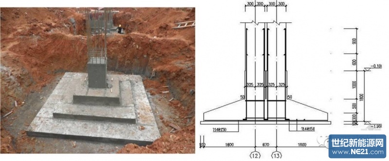 钢筋混凝土独立基础由基础底板(垫层)与底板上面的基础短柱组成,在光伏支架的前后立柱下面分别设置。短柱顶部设置预埋件(钢板或地脚螺栓)与上部的光伏支架相连,需要一定的埋深和一定的基础底面积;基础地板上覆土,用基础自重和基础覆土重力共同抵抗环境荷载导致的上拔力,用较大的基础底面积来分散光伏支架向下的垂直荷载,用基础底面和土壤之间的摩擦力以及基础侧面与土壤的阻力来抵挡水平荷载。
