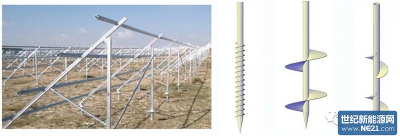 光伏支架的前后立柱下面采用带螺旋叶片的热镀锌钢管桩,旋转叶片可大可小、可连续可间断,旋转叶片与钢管之间采用连续焊接。