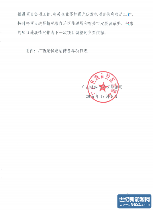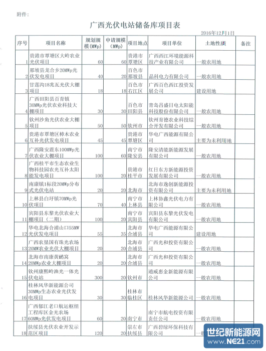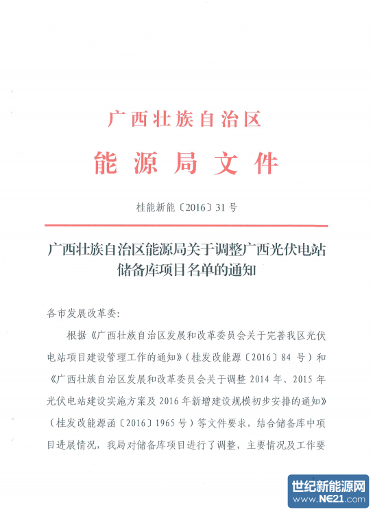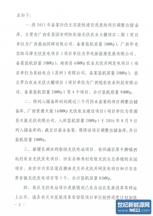 一、将2015年备案单仍无实质进展项目调整出储备库。主要有广西农垦国有明阳农场光伏农业大棚项目二期(项目单位为广西鼎旭同辉有限公司,备案装机容量30MWp)、广西华电宾阳马潭光伏发电项目(项目单位为华电新能源发展有限公司, 备案装机容量20MWp)、靖西县60MWp农业光伏并网发电项目(项目单位为美桔电力(苏州)有限公司,备案装机容量20MWp )、崇左罗白农业光伏大棚项目(项目单位为广西悦农农业科技有限公 司,备案装机容量2(MWp)等4个项目,合计装机容量90MWp。