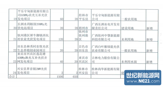 三、新增长洲水利枢纽光伏电站项目、钦州港区犀牛脚镇西坑村农业光伏发电项目、田东县林秀村农牧光伏生态养殖创业园 项目、来宾市兴宾区莲花塘渔光互补光伏并网发电项目和兴安县界首镇光伏发电项目等5个,合计装机容量82MWp。