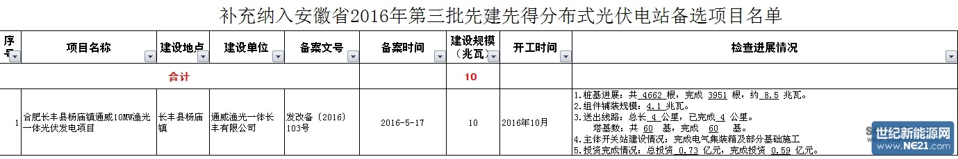 电站管理的通知》(皖能源新能〔2016〕13号)要求,合肥市发展改革委12月19日上报了合肥长丰县杨庙镇通威10兆瓦渔光一体光伏发电项目,申请纳入2016年第三批先建先得备选项目目录。考虑合肥市地方财政补贴政策执行时间,现将该项目予以补充公示。 公示时间从2016-12-20至2016-12-28
