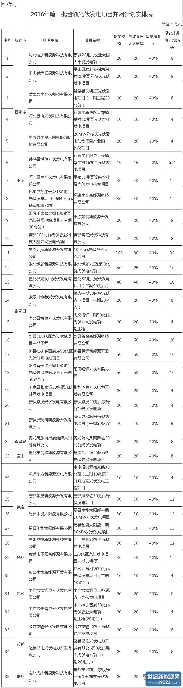 附件:2016年第二批普通光伏发电项目并网计划安排表