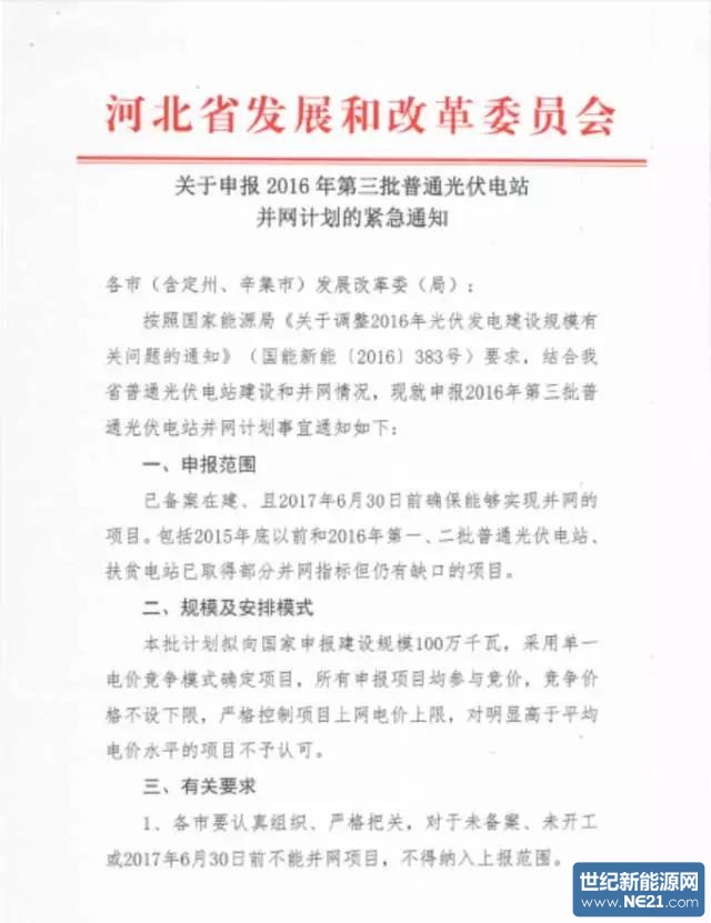 河北第三批普通光伏电站并网计划:申请1GW光伏增补指标 投资商26号前上报