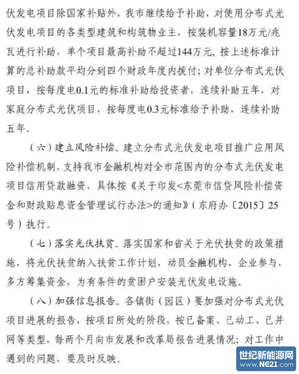 2017年至2018年,东莞备案并完成装机并网的分布式光伏项目享受以下补贴:一次性装机补助部分每兆瓦18万元,并平均到4个财政年度拨付,每个项目最高补助144万元;发电补助部分企业投资项目0.1元/千瓦时,个人投资项目0.3元/千瓦时,连续补助5年。