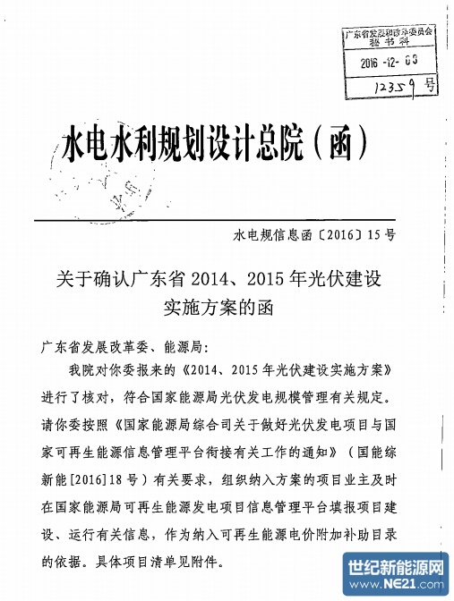 现将水电水利规划设计总院《关于确认广东省2014、2015年光伏建设实施方案的函》(水电规信息函〔2016〕15号)转发给你们,请做好光伏发电项目建设的监督管理工作,督促列入方案的各项目业主积极落实项目建设条件,促进项目建成投产并网发电。同时通知项目业主按照要求在国家能源局可再生能源发电项目信息管理平台及时填报项目建设、运行有关信息。