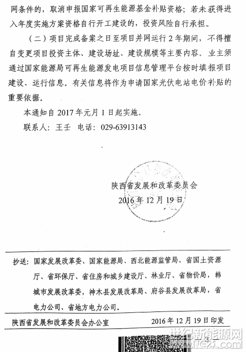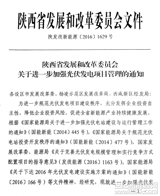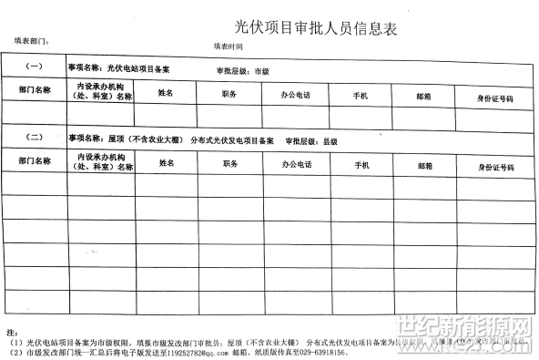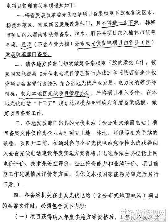 世纪新能源网消息:近日,陕西下达进一步加强光伏项目管理通知。通知指出,省发改委将备案权下放至各区市。屋顶(不含农业大棚)分布式光伏由各县(区)发改部门备案。