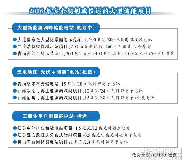 得益于企业和地方政府的努力,2016年,已经有多个大型储能项目规划或投运,主要集中在新能源并网消纳、无电地区电网建设、工商业储能等相关领域。例如,已经投运的青海格尔木光储电站项目,西藏双湖可再生能源局域网项目、江苏中能硅业储能电站项目等,都运用了不同技术路线的储能系统。