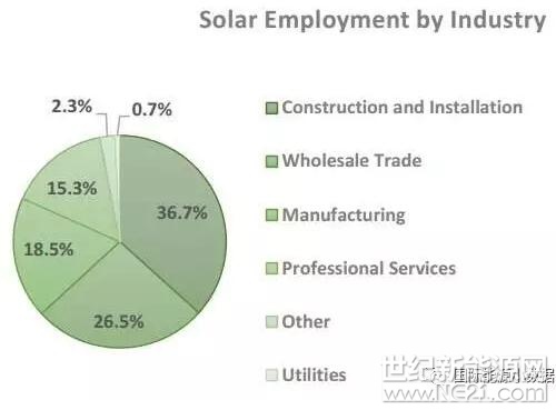 比较一下,美国太阳能行业是创造就业的大户,其从业人数大约是化石能源火电行业的从业人数2.5倍。在太阳能行业的37万多从业人员当中,36.7%是施工和安装人员;26.5%是市场营销人员;18.5%是制造业人员;15.3%是专业服务人员,其他相关从业人员占3%。