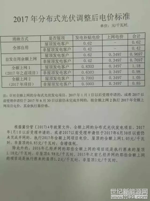 调整后电价标准》,该文件明确指出2017年备案屋顶分布式全额上网项目无论是否630前并网均按新电价执行,加上省补为1.05元,而在17年前备案项目630前并网按16年1.18元(含省补)执行,630未能并网按17年执行!具体详见原文:
