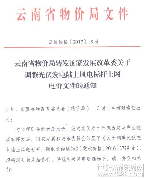 云南2017年光伏标杆上网电价:0.75元/每千瓦时(含税)