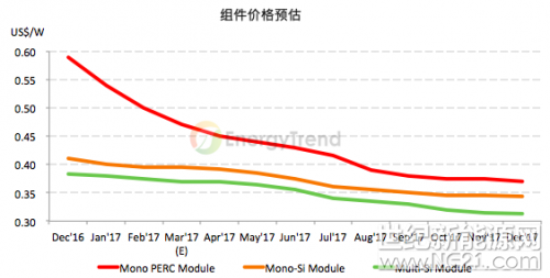 若单晶硅片价格跌落,P型单晶组件的性价比将更加明显,多晶为主之厂商为维持竞争力,导入金刚线切多晶硅片变为势在必行的选项,但与之搭配的黑硅技术情形仍显复杂。不仅干法、湿法、添加剂直接蚀刻等技术路线未定,硅片厂、电池厂仍在权衡由哪一方进行黑硅技术的导入,黑硅电池也仍需解决效率的稳定性以及外观问题。由此看来,同时拥有硅片、电池片、组件的垂直一体化厂商可能在第三季领先力推黑硅组件,为黑硅产品的推动领航。预期明年黑硅产品将明显放量,让多晶电池片能接受金刚线切的多晶硅片,整体多晶组件成本能下降US$ 0.015 / W左右,以抗衡单晶市占的高度成长。