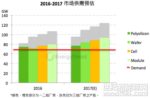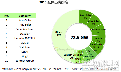 回顾2016年,火热的中国需求让场前十大厂商排名发生变化。除了让晶科以6.7GW的组件发货量跃居排名第一宝座、以中国内需为主的协鑫集成、乐叶光伏发货量大增,也让单晶为产品强项的尚德集团重新名列十大出货厂商。今年在全球需求相比去年持平、甚至有可能略减的情况下,出货仍在成长中的前五大厂晶科、天合、阿特斯、韩华、晶澳将占据全球超过40%的出货,维持组件出货更加集中化的态势。