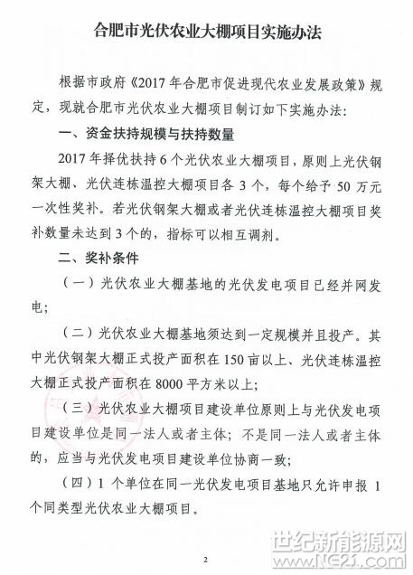 农业项目实施办法》。办法对光伏农业大棚项目予以肯定。并提出对光伏大棚给予50万一次性奖励,2017年该市原则上支持6个项目。