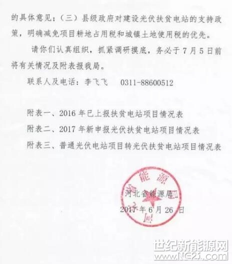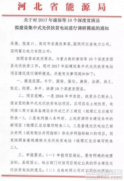 河北能源局关于对2017年康保等10个深度贫困县拟建设集中式光伏扶贫电站进行调研摸底的通知
