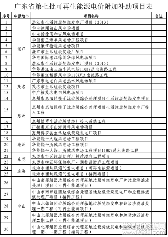 广东省第七批可再生能源电价附加补助项目
