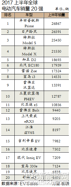 与去年同期相比,今年上半年全球电动汽车销量20强榜单名次变化不大。不过,中国知豆D2 首次闯进前5名,其6月销量达到4814辆,超过北汽EC180,成为排名最高的中国车型。除了这两款车型,前20名中还有7款中国车型,分别是排名第11的比亚迪e5、排名第13的上汽荣威eRX5、排名第14的江淮iEV6S、排名第15的吉利帝豪EV、排名第16的比亚迪唐、排名第19的比亚迪宋和排名第20的奇瑞eQ。在全球电动汽车销量20强榜单中,共有9款中国车型上榜,几乎占据半壁江山。