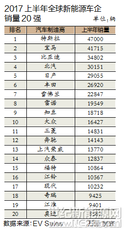 今年上半年,特斯拉全球销量达到47000辆,成为全球销量最高的电动汽车制造商。宝马紧随其后,累计销量达到41715辆。比亚迪排名第三,累计销量34802辆。上半年比亚迪受各种因素影响未能发力,导致其排名由2016年同期的第一名滑落至第三名。今年前4个月,比亚迪一直处于“蛰伏期”,销量不佳除了与今年年初中国新能源汽车目录调整和财政补贴退坡有关,也受到其产品升级、电池产能爬坡、新产品投放等自身因素的影响。
