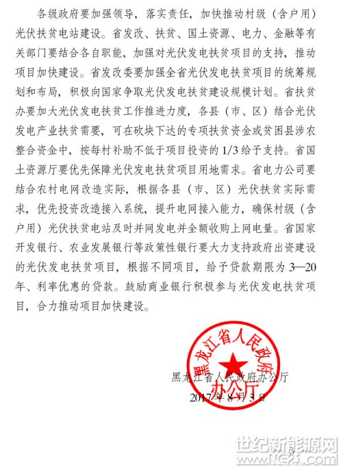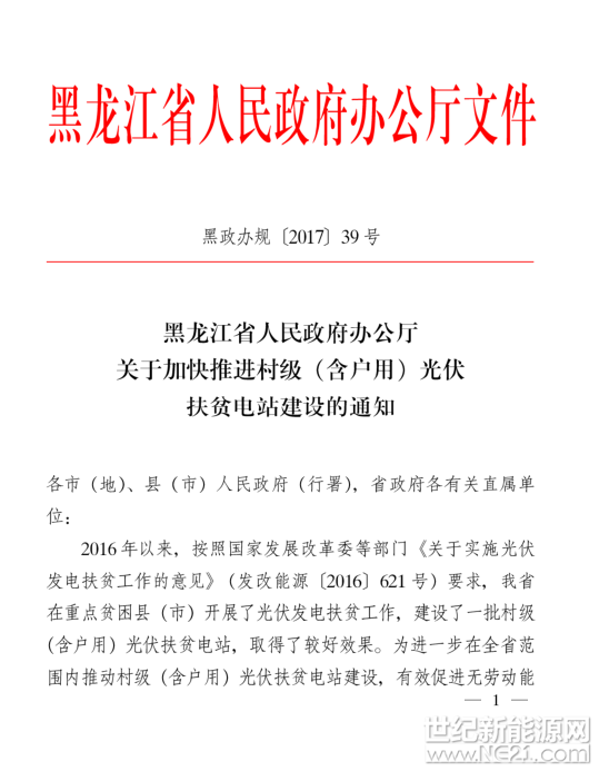 黑龙江省人民政府办公厅关于加快推进村级(含户用)光伏扶贫电站建设的通知
