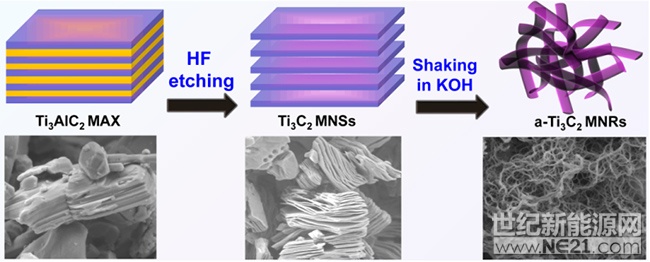 MXene是一类新型二维金属碳(氮)化物纳米片,常见的Ti3C2MXene片已被证实是一种先进储能电极材料,但传统由氢氟酸刻蚀制备的MXene材料存在层数堆叠严重、层间距较小,作为电极材料时比容量较低且循环性能差。因此,急需开发结构和性能稳定的MXene基新型储能材料。