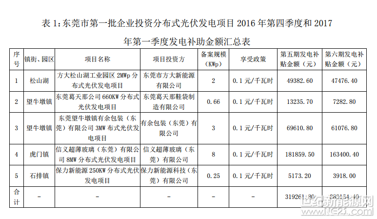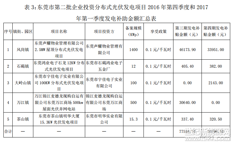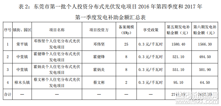 广东东莞市前四批分布式光伏项目补助名单(2016-2017Q1)